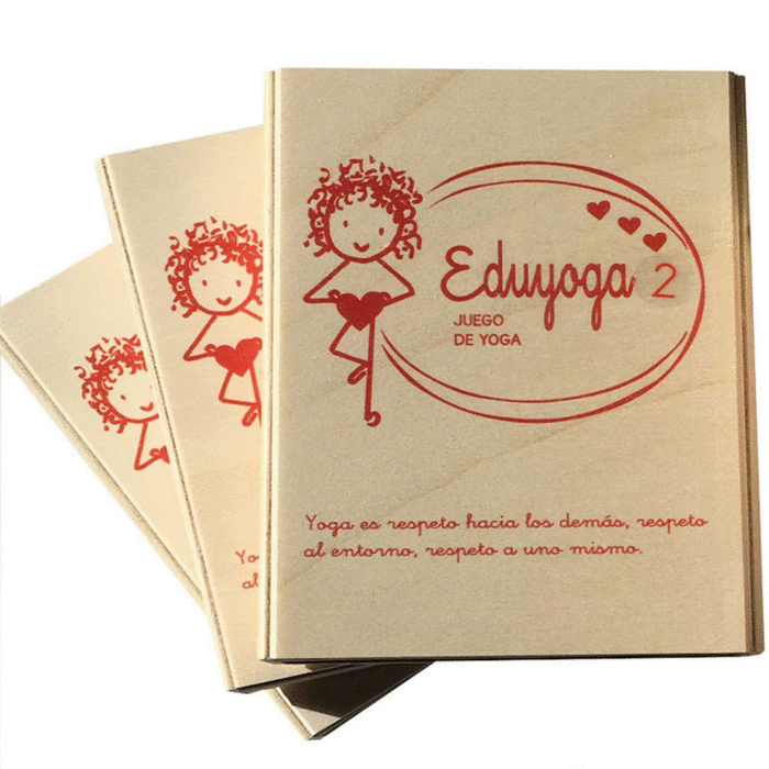 Consta de 27 cartas con una presentación muy cuidada. 20 cartas son de posturas de yoga relacionadas con animales o elementos de la naturaleza, donde detrás de cada una podemos encontrar tres apartados: "Como lo hacemos", "Cómo ayuda nuestro cuerpo" y "Cómo ayuda nuestro humor". 4 cartas son de respiraciones, donde detrás también explica "Cómo lo hacemos" y "Cómo ayuda nuestro humor". Se proponen dos reglas de juego, una de memoria donde se practican las posturas, y la otra, más creativa y en grupo, los niños deben inventar y representar una historia con todas y cada una de las cartas que les ha tocado. Para completar el juego de yoga hay dos cartas donde se explican dos cuentos, los cuales nos dan dos lecciones importantes para la vida: "El camino de la fuente", describe la necesidad de amarse y valorarse a uno mismo y "El cuento de la felicidad" que nos muestra donde debemos buscar para encontrar la felicidad.